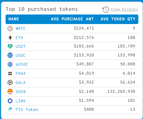 Looking at the top 10 most purchased tokens over the past 24 hours, Wrapped Bitcoin (WBTC) and Ethereum lead the way, followed by four stablecoins with average buy-in amounts of: