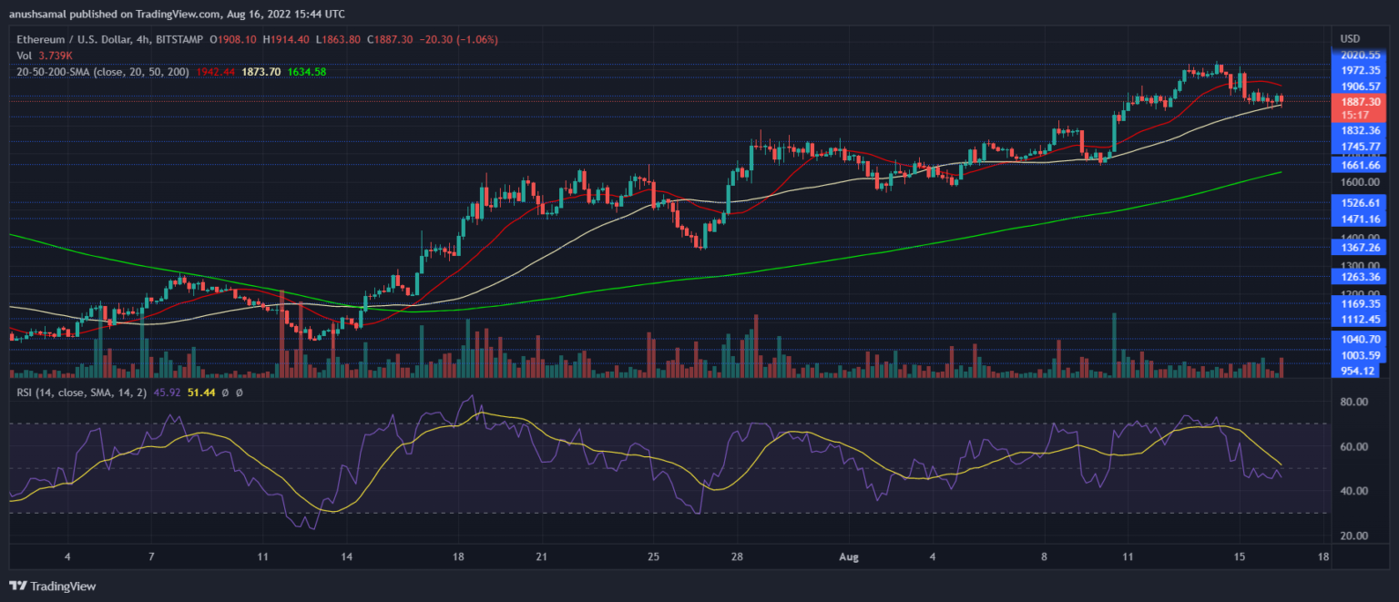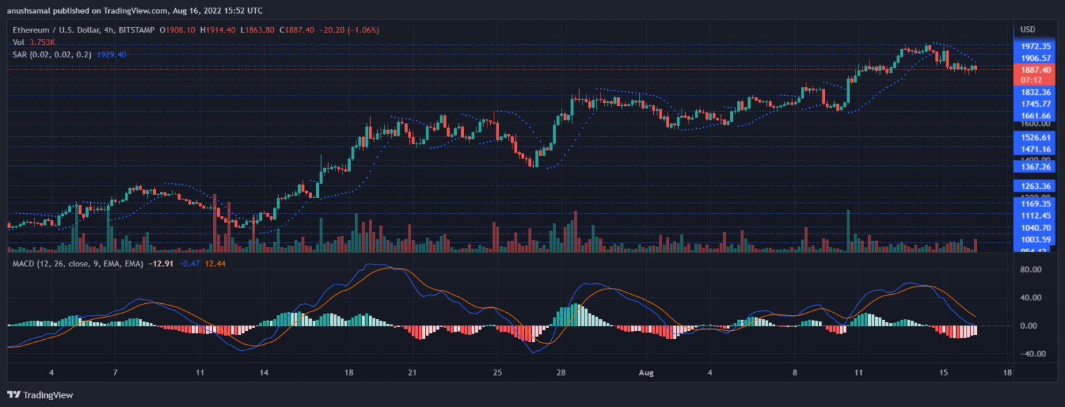 Ethereum price has retraced over the past few days, in the last 24 hours the coin depreciated 2%. The current price action pointed towards consolidation. In the past trading sessions, ETH has retraced beneath the $1,900 price mark.