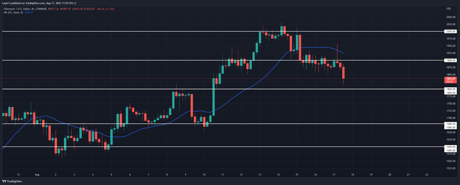 Eventually, the Ethereum price reacted even lower as selling pressure continued throughout the day. However, the next support at $1,800 could not be reached, likely meaning that further tests of the downside will follow overnight.