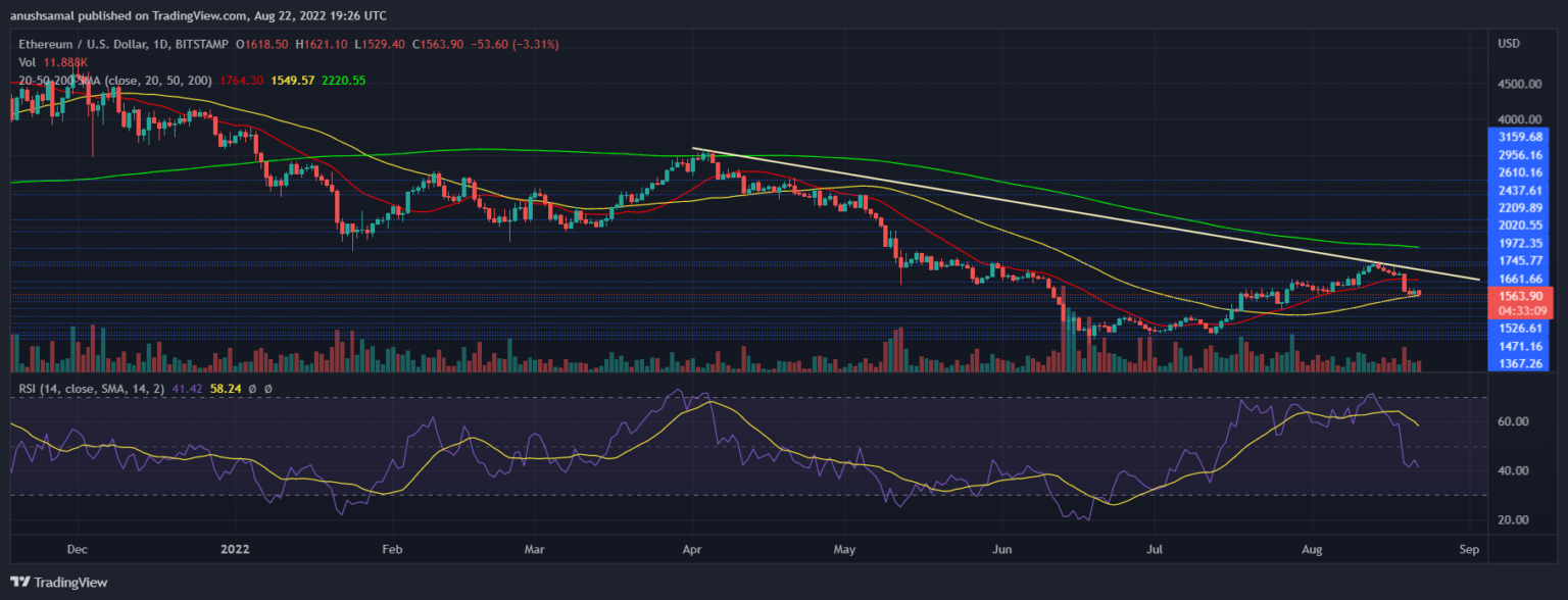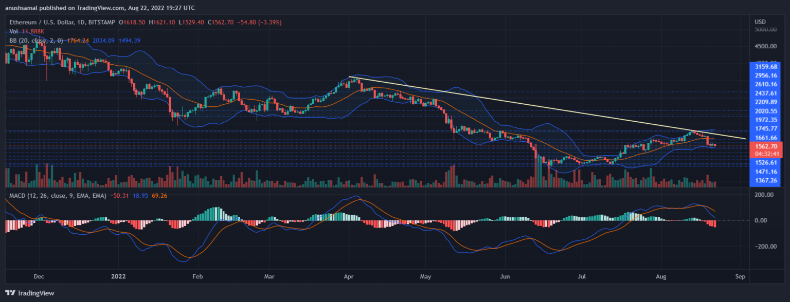 At the present the coin was trading extremely close to $1,500 which is its immediate support level. The descending trendline was also crossing the price ceiling of $1,700, this makes the aforementioned level an important price ceiling. Amount of ETH traded increased depicting that selling momentum moved up.