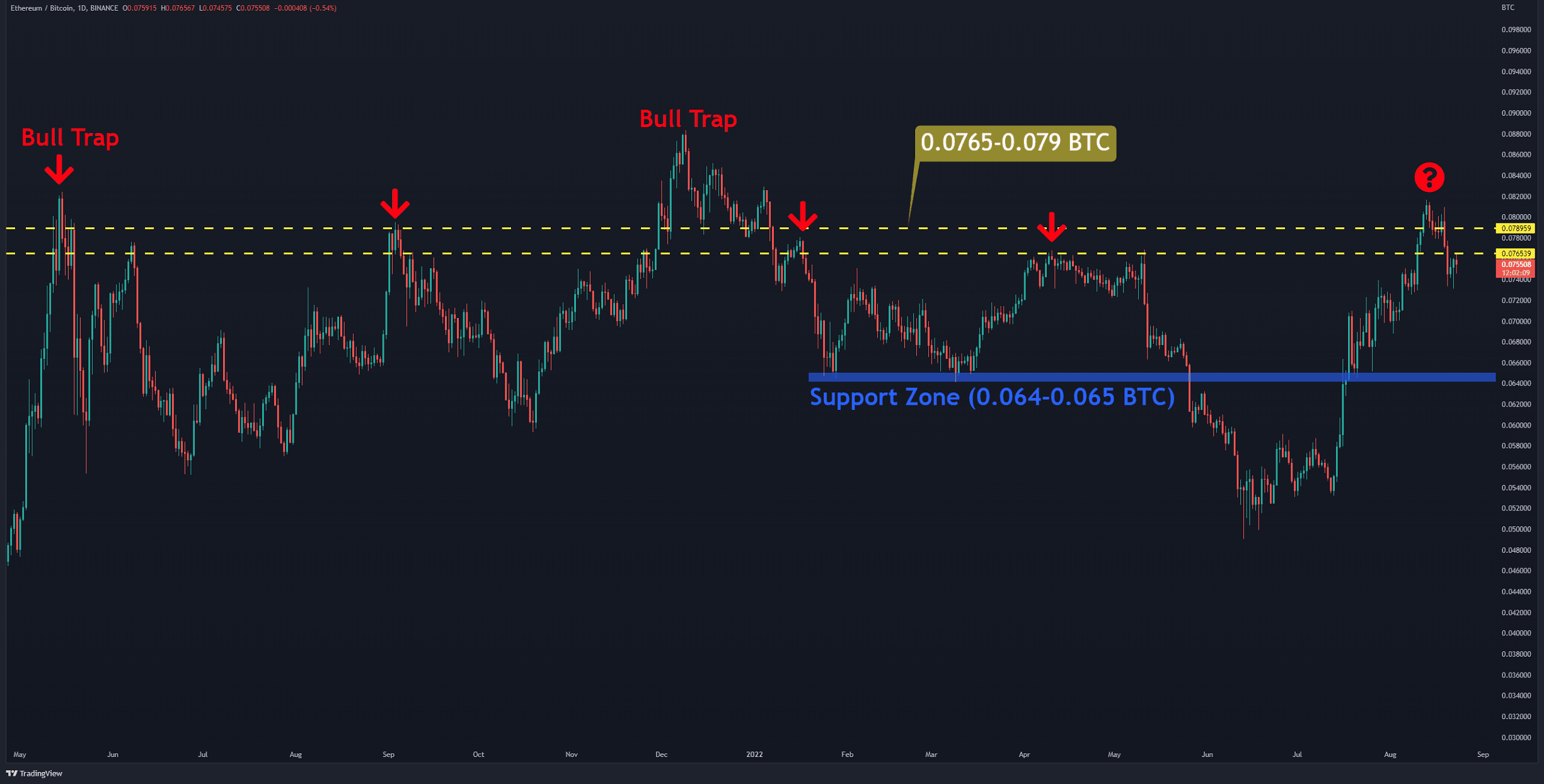 Although it is impossible to predict the future based on past events, considering the recent vertical bullish trend, it seems reasonable to be more cautious. Another rally will begin if the ETH price against BTC can break above the last high (0.082 BTC).