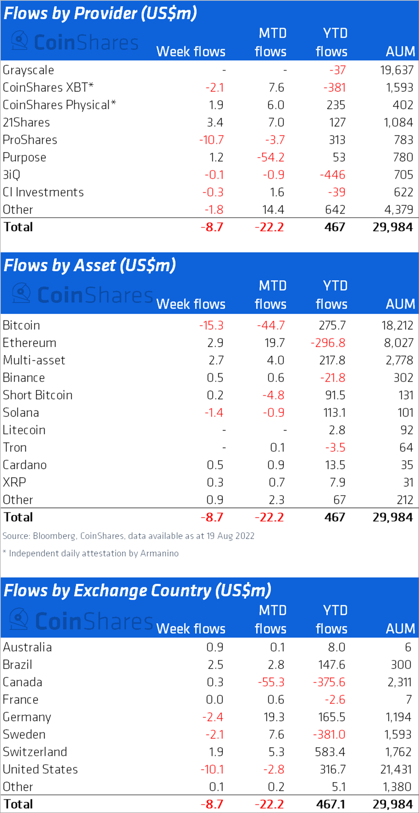 “Ethereum saw weekly inflows totaling US$3m and has seen a turn-around in sentiment. At the mid-point in June Ethereum investment products had seen year-to-date outflows totaling US$459m. Since this point, as there has been improving clarity on the Merge, Ethereum has seen a 9-week run of inflows totaling US$162m.”