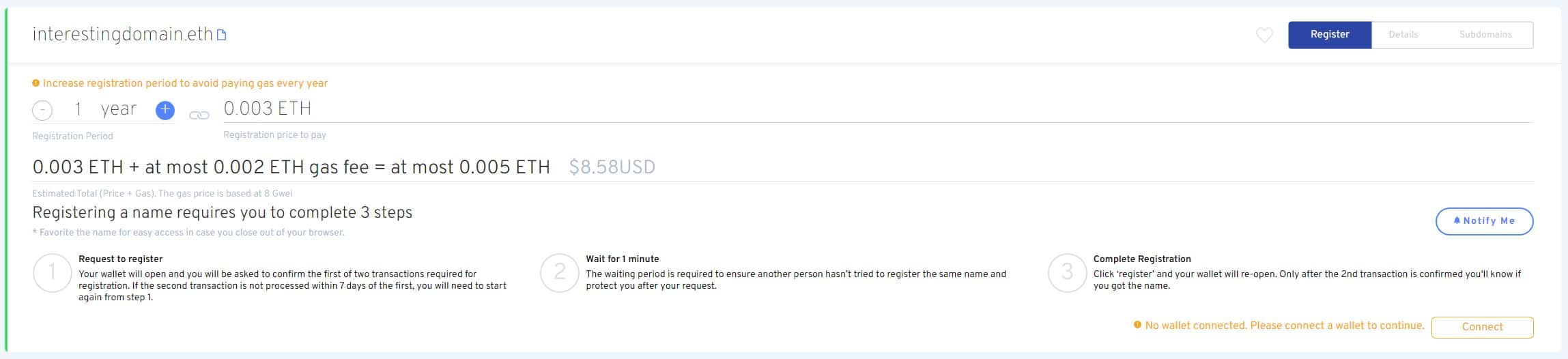 Registering an Ethereum Name Service domain is pretty straightforward, and all you need to do is have a hot wallet such as MetaMask.