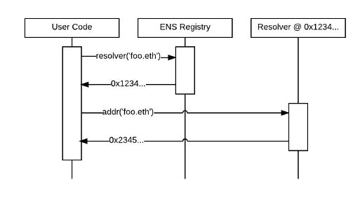 The first one is to ask the registry what resolver is responsible for the said name. The second one is to ask that particular resolver for the answer to the query. In terms of architecture, it looks like this: