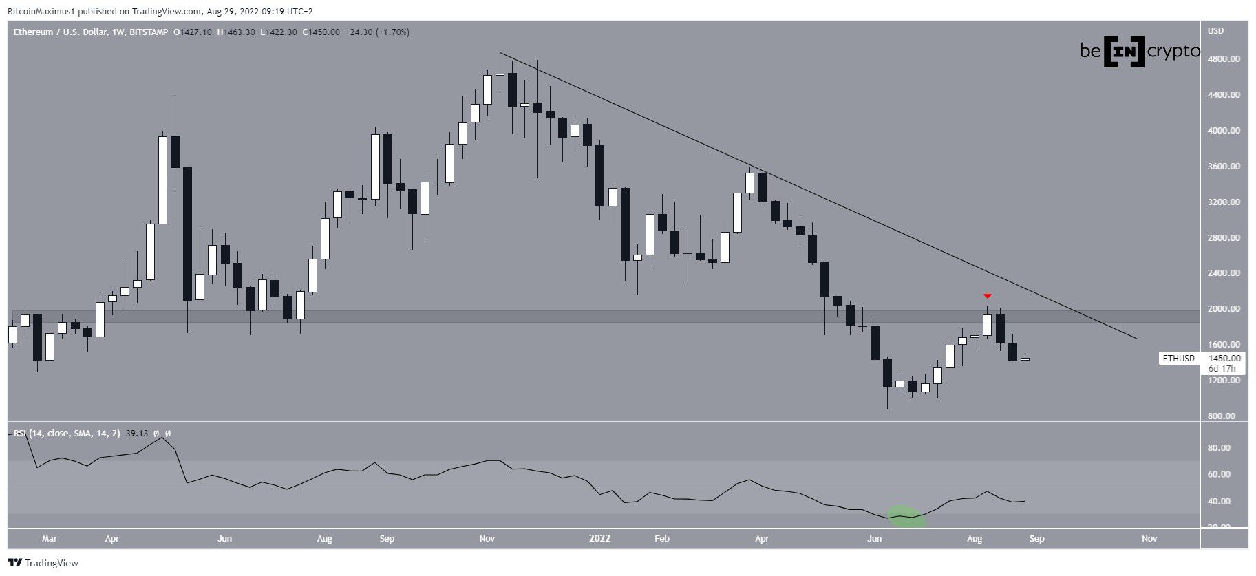 Ethereum has been falling underneath a descending resistance line since reaching an all-time high price of $4,868 in November 2021. The downward move has so far led to a local low of $880 in June 2022. The low also coincided with a new all-time low in the weekly RSI (green circle).