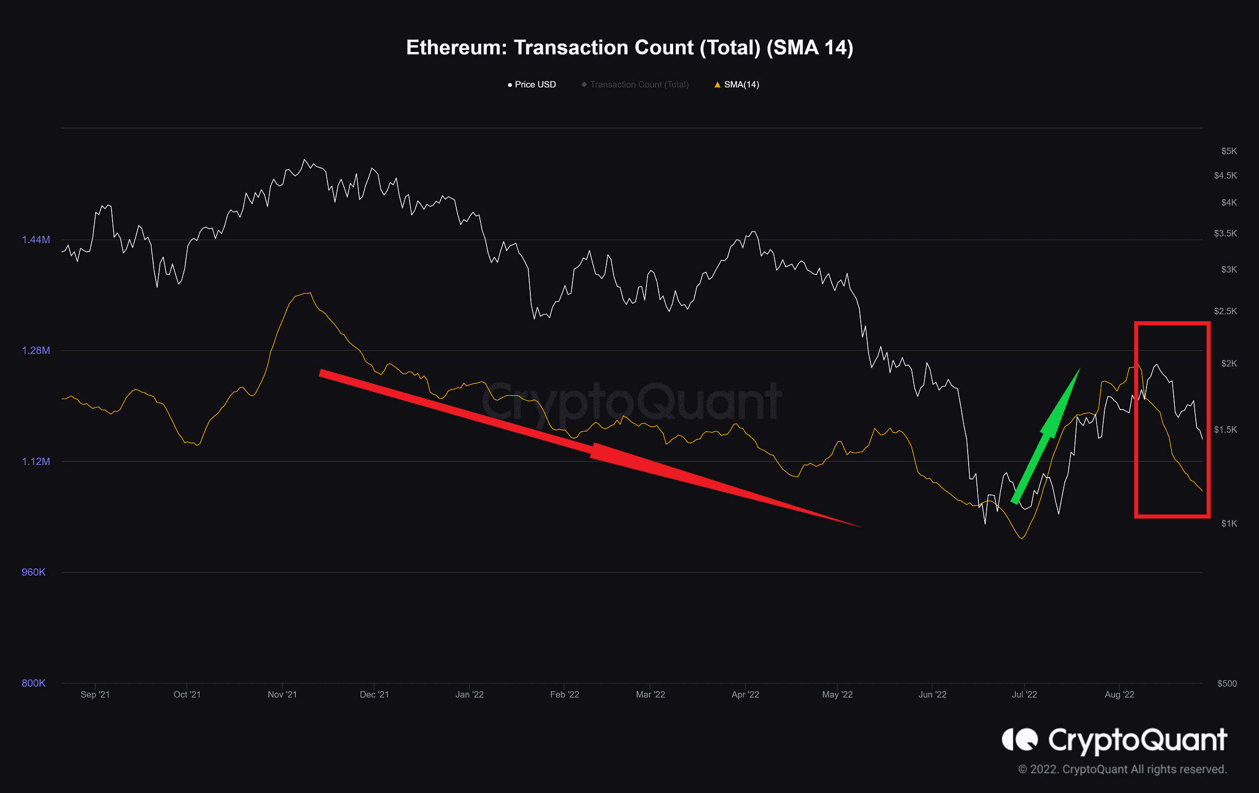 The number of transactions on the network, which had an utterly downward trend since the all-time high, increased sharply during the recent bullish leg. This was likely due to recently released news about the Merge.