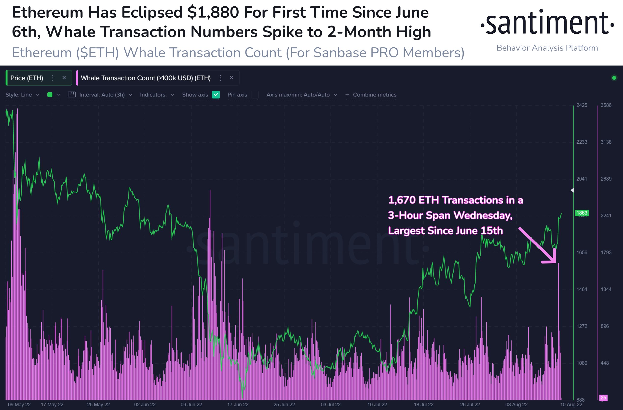 “Ethereum surged back over $1,880 after a positive CPI report Wednesday. This two-month high in price came with a major influx of ETH transactions valued at $100,000 or more. This is happening in tandem with whale addresses appearing to be accumulating.”