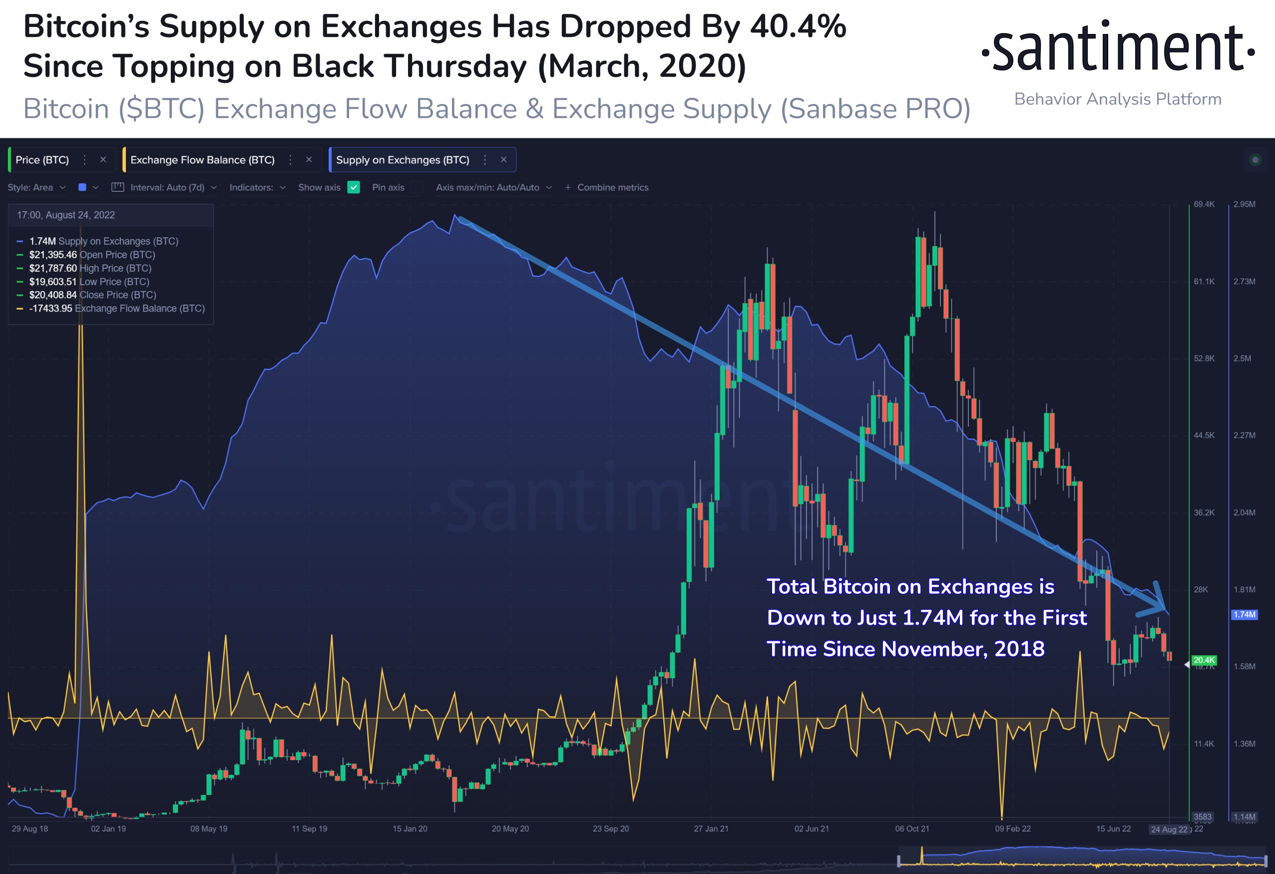 The crypto analytics firm notes that Bitcoin continues to move off exchanges despite its price volatility throughout the past couple of years. The king crypto’s exchange supply recently hit its lowest level since late 2018.
