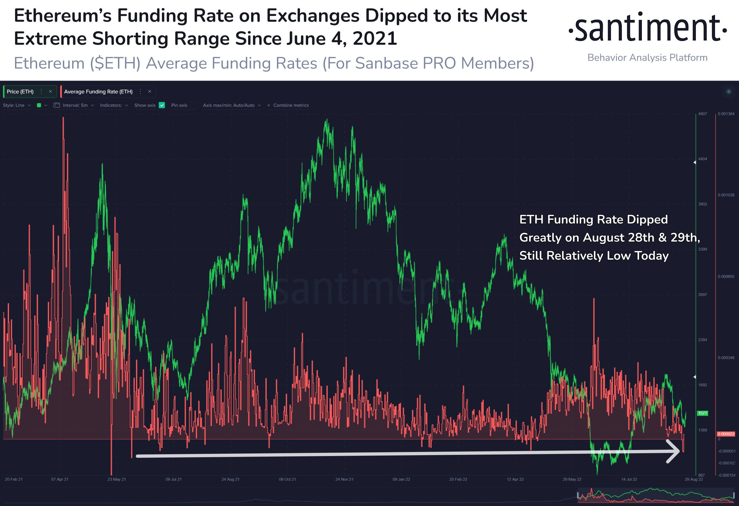 “The Ethereum disbelief is strong from traders during a particularly volatile week of trading. The crowd has shorted, across exchanges, at the largest ratio since June of 2021. Historically, price rises are more prevalent in these conditions.”