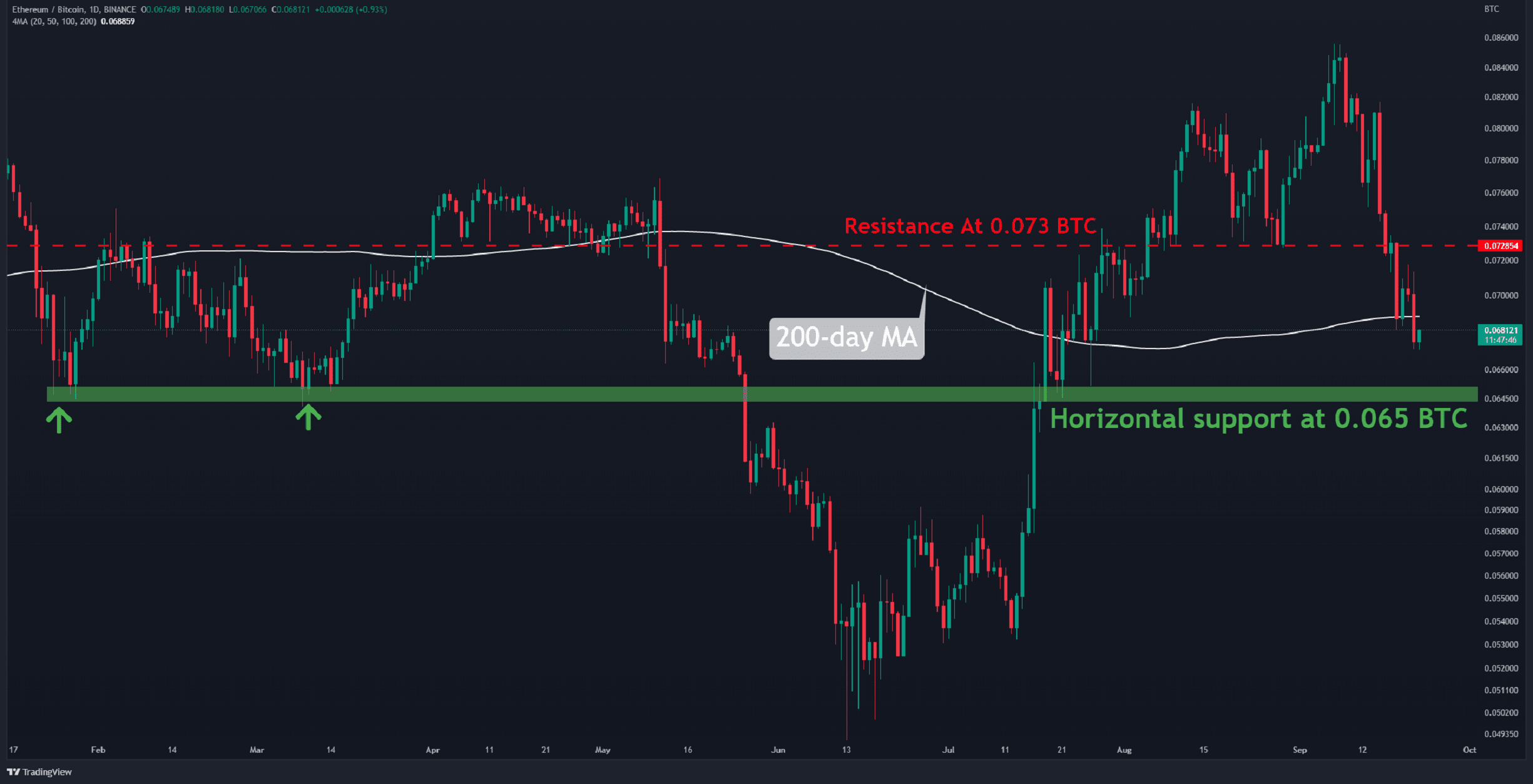 Yesterday, after more than two months, ETH / BTC trading pair closed below the 200-day moving average line (seen in white). Given the dominance of the bearish sentiment of the market, there is a considerable likelihood that 0.065 BTC (in green) will be retested as support.