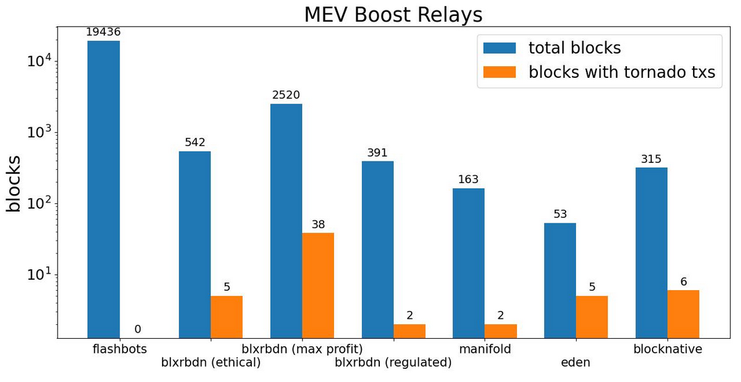 These findings are reinforced by Ethereum researcher Toni Wahrstätter, who published research on Sept. 28 suggesting that of the 19,436 blocks verified by the Flashbots Mev-Boost Relay, none included a Tornado cash transaction.