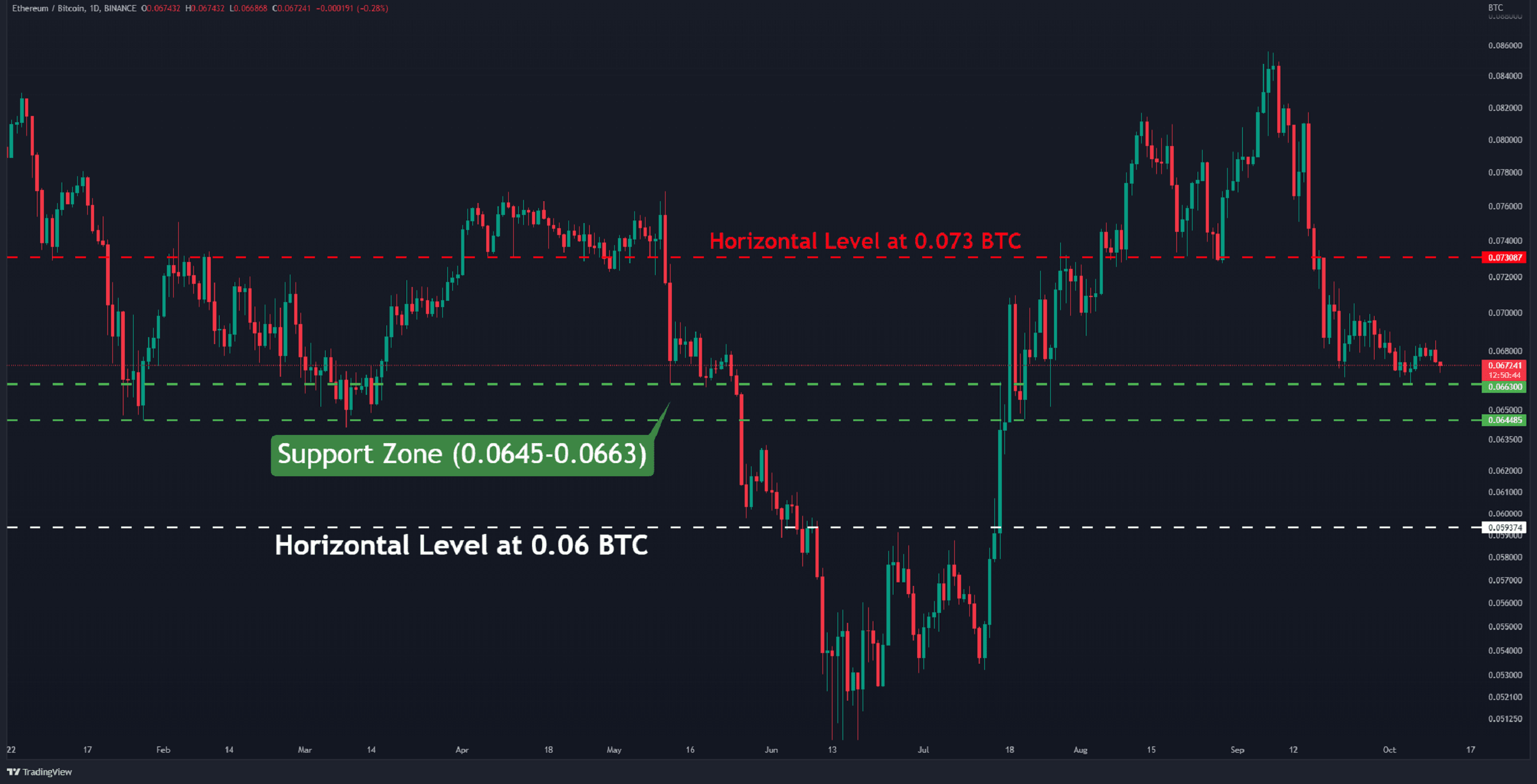 Against Bitcoin, the cryptocurrency is trading above the support zone between 0.0645 and 0.0663 BTC (in green). A break and close below it would pave the way for another leg down towards 0.06 BTC (in white).
