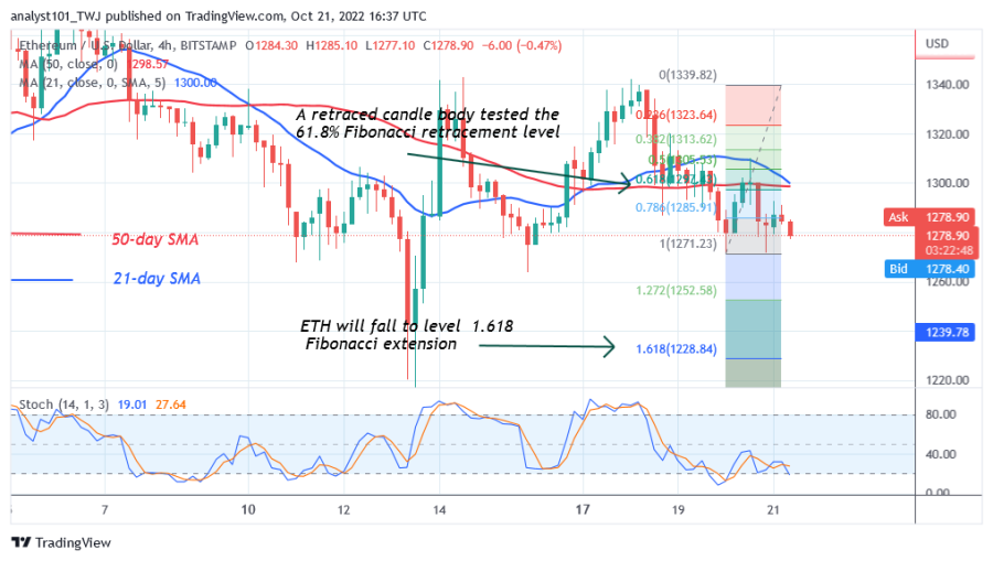 On the 4-hour chart, it is likely that Ether will continue to fall as it faces the rejection of the high at $1,300. In the downtrend from October 20, Ether has completed an upward correction and a candlestick has tested the 61.8% Fibonacci retracement level. The correction suggests that ETH will fall to the 1,618 Fibonacci extension level or $1,228.84.