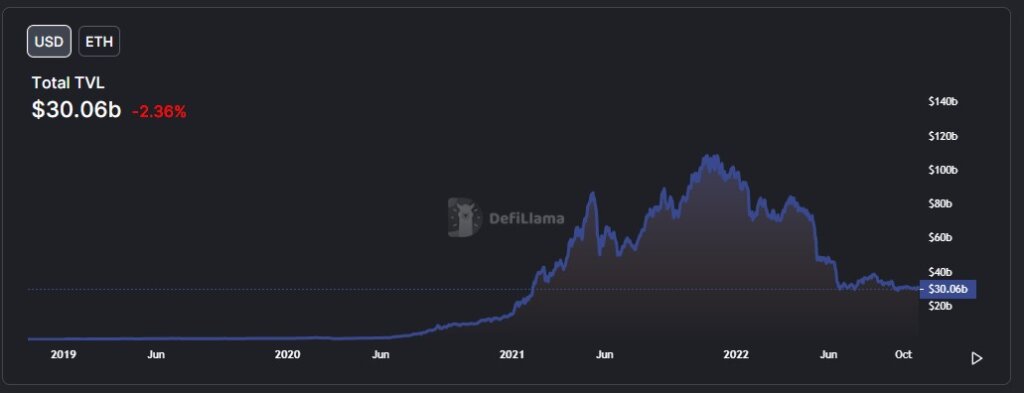 When all of DeFi is considered, including liquid staking, the total value staked Ethereum tallies up to 22.38 ETH, down 26% from its all-time high in November 2021. When reviewing the TVL denominated in USD of any crypto asset, it is essential to understand the underlying asset’s price throughout time.