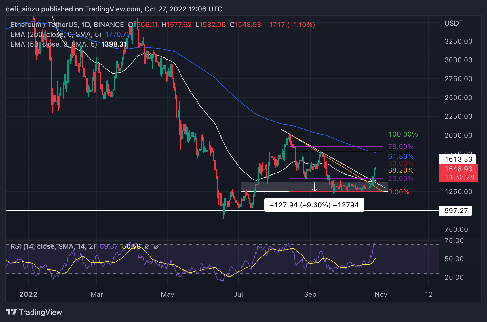 The price of Ethereum (ETH) has continued to hold strong as price trends toward the region of $1,700 as the price faces a key issue ahead of a big move, considering how tough breaking above $1,450 has been for the price of Ethereum after moving in range for several weeks. The past few days have seen the crypto market has looked more decent, with the likes of Bitcoin (BTC) and Ethereum (ETH) showing some great price movement in recent times. With ETH price rallying from $1,300 to a region of $1,580 as price aims to outperform BTC in the coming days ahead of its monthly close. (Data from Binance)