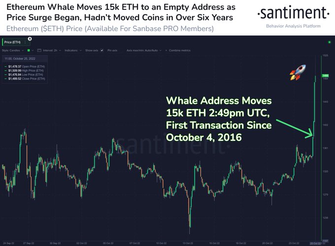 “An Ethereum whale wallet that had not been active for 6+ years woke up today and moved $22.2 million worth of ETH to an empty wallet. ETH’s price is +8.1% since this transaction, briefly jumping over $1,500 for the first time since the merge 6 weeks ago.”