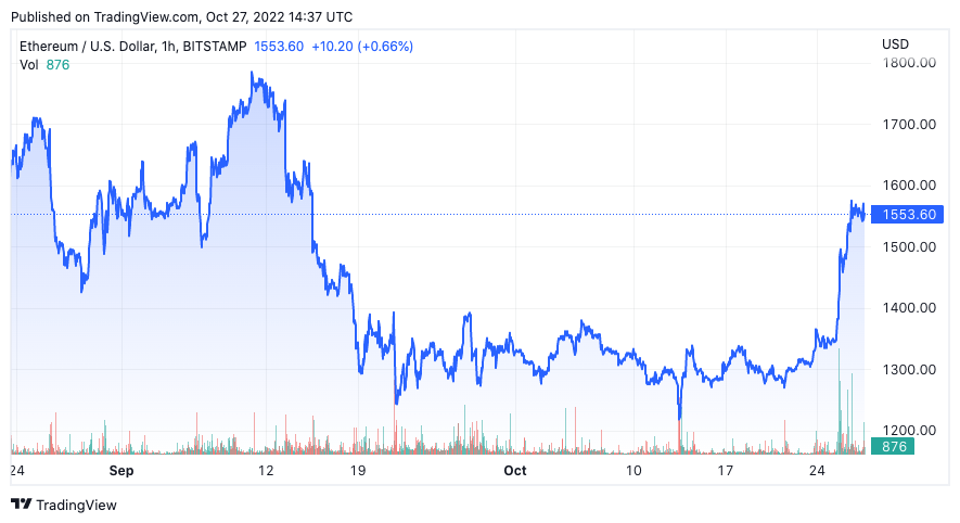 After almost a month of flatlining, ETH experienced a notable spike and saw its price increase to $1,560 from $1,300 in less than two days. The positive price action rose its market cap to $190 billion and entered ETH into the top 50 assets by market cap.