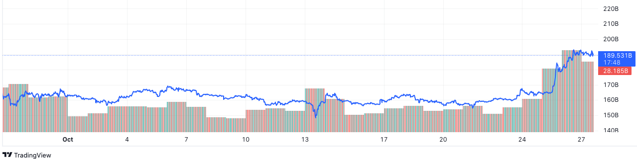Ethereum currently stands head-to-head with giants such as Toyota and Walt Disney, whose market caps hover around $195 billion.