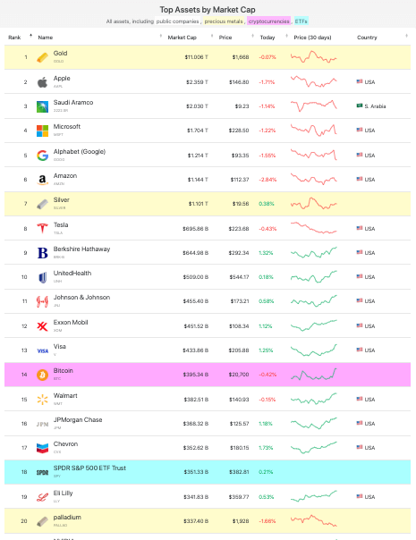 Ethereum has become the second cryptocurrency ever to enter the top 50 assets by market cap. With a value of over $395 billion, Bitcoin takes up 14th place among the most valuable assets in the world, squeezed between Visa and Walmart.