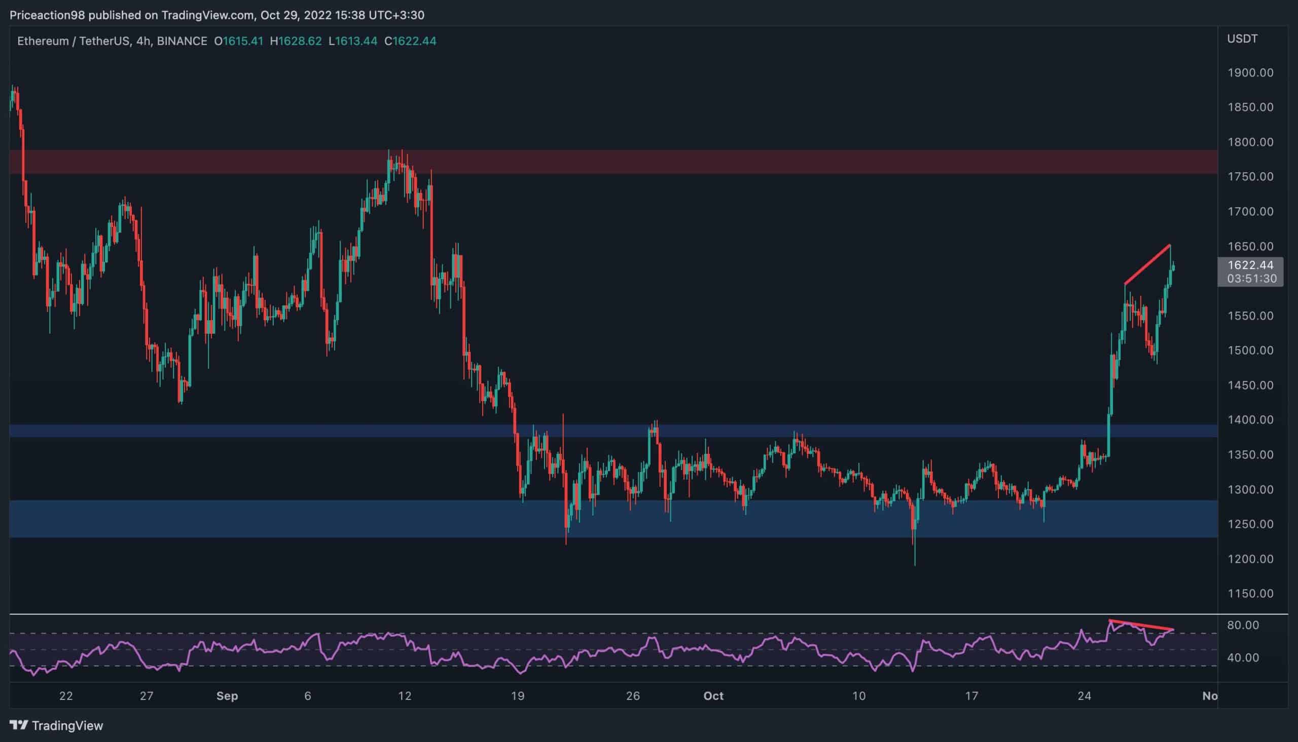 The 4-hour timeframe is also looking bullish as the market has impulsively broken above the $1400 level, rallying toward the $1800 resistance area.