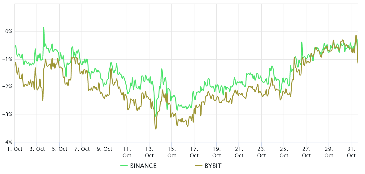 The indicator should trade at a 4% to 8% annualized premium in healthy markets to cover costs and associated risks. Hence, the above chart clearly shows a prevalence of bearish bets on ETH futures, as its premium stood in the negative area in October. Such a situation is unusual and typical of bearish markets, reflecting professional traders' unwillingness to add leveraged long (bull) positions.