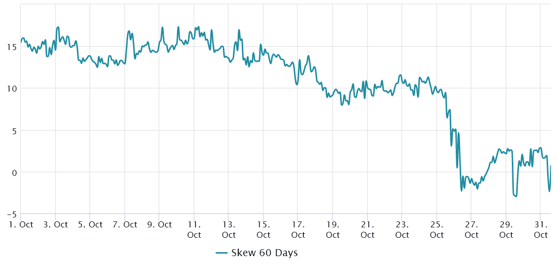 The 60-day delta skew had been above the 10% threshold until Oct. 25, and signaling options traders were less inclined to offer downside protection. However, a significant change happened over the following days as whales and arbitrage desks started to price a balanced risk for downward and upward price swings.