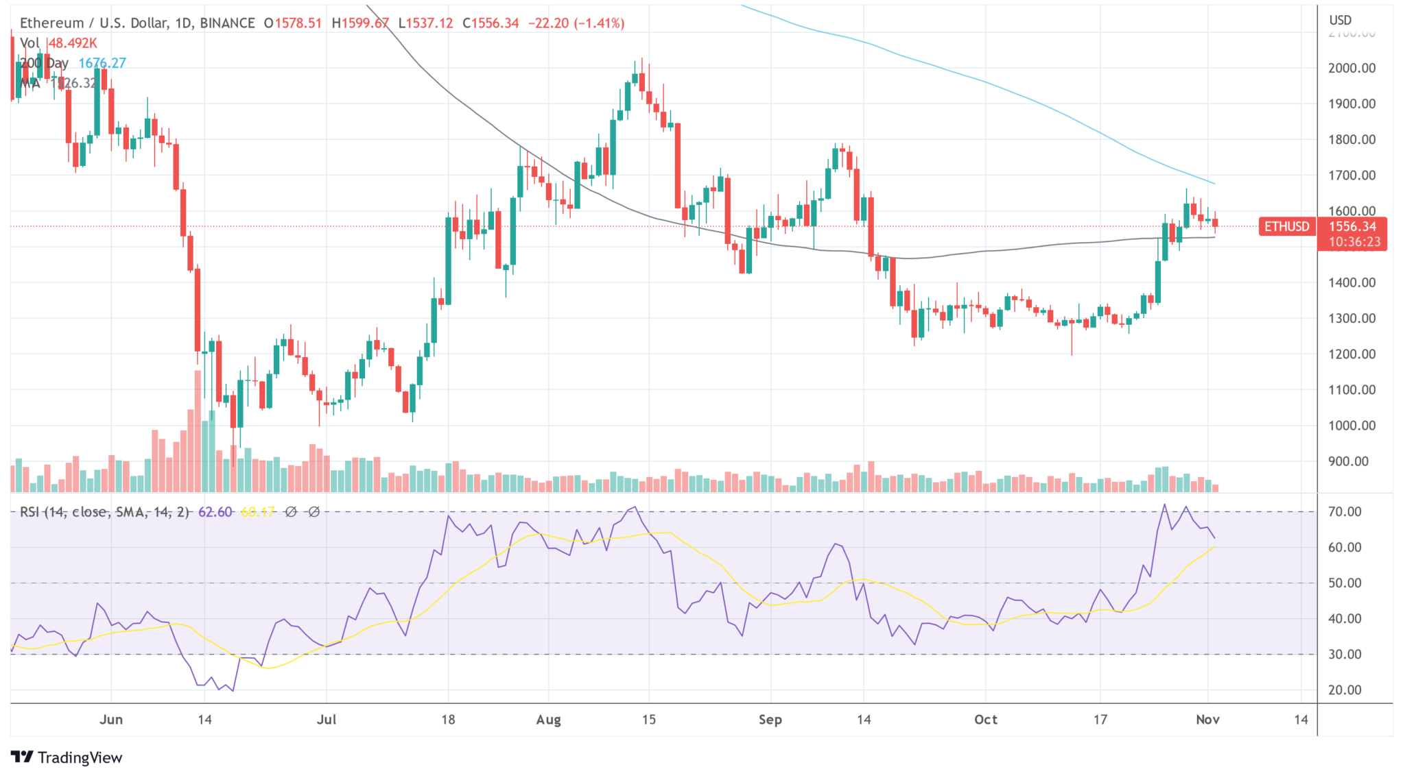 Ahead of today’s FOMC meeting, ETH investors seem to remain cautious. The price is moving below the 200-day moving average, but above the 100-day moving average.