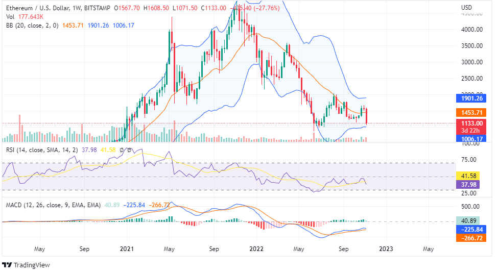 At the time of writing this post, ETH was trading around $1131. After taking support around $1250, it was in the uptrend, but in the last two days, Ethereum has plunged more than 15% and tested the support of $1050.