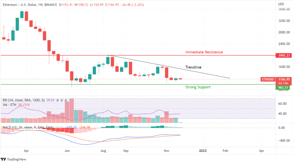 Weekly charts confirm the price trend analysis for a long-term impact. The outlook of the token seems to have met its match, with resistance being developed with a declining trendline. The resistance has developed near the $2000 mark, with support being available at $981.