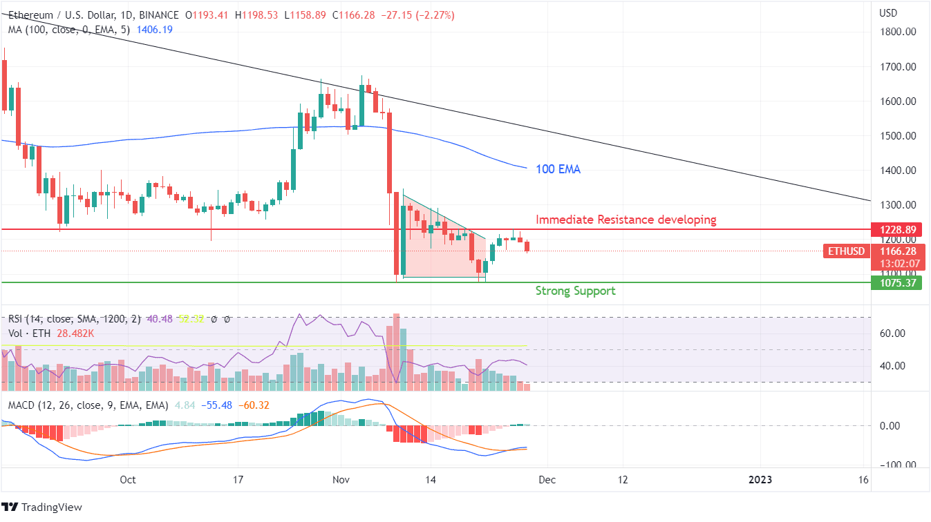 Ethereum token is facing severe backlash since failing to sustain even the 100 EMA curve at the beginning of November 2022. The overall negative sentiment after the entire FTX debacle has left investors in a volatile state. The buy-on-dip strategy famous for cryptocurrencies has turned into sell and exit mode for newcomers.
