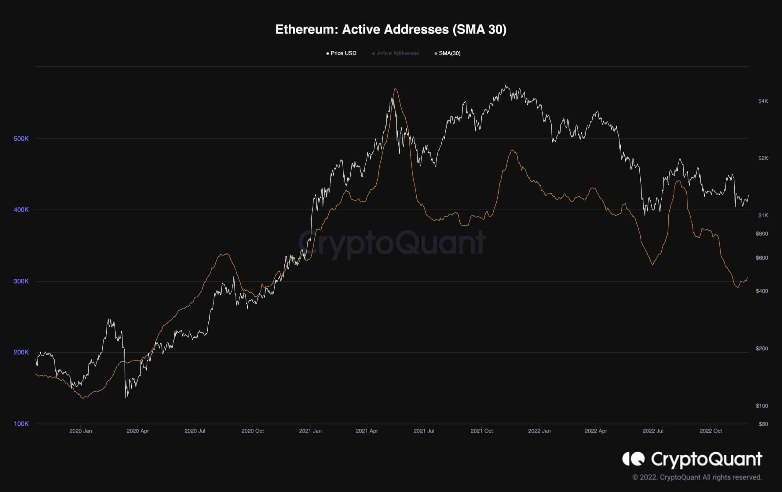 Examining the chart, its value positively correlates with Ethereum’s price. However, the metric’s 30-day moving average has been in a significant downtrend since July 2022 and dropped to a new yearly low, indicating that there may be a worrying lack of demand for the Ethereum blockchain.