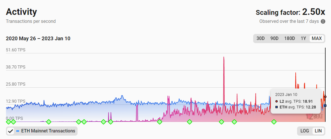 Ethereum processed approximately 12.28 TPS on average on January 10 compared to the L2’s average of nearly 18.91 TPS. According to L2Beat archive, the first crossover between L2 and ETH average TPS was on September 24, 2021. The average TPS on L2 was 19.55 and on ETH was 13.34. The historical peak was attained during March 11, 2022 with L2 with 48.96 average TPS and ETH lacked behind with a average difference of 36 TPS.