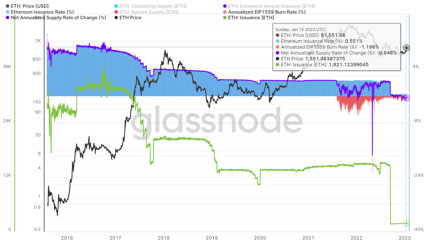 Indeed, as of Sunday the 15th of January, Ethereum’s annual issuance rate was around 0.55%, while its burn rate was just under 1.2%. As a result, Ethereum is currently experiencing deflation at a rate of around 0.65% per year. Back when Ethereum was still a proof-of-work blockchain, its inflation rate was 4-5%.