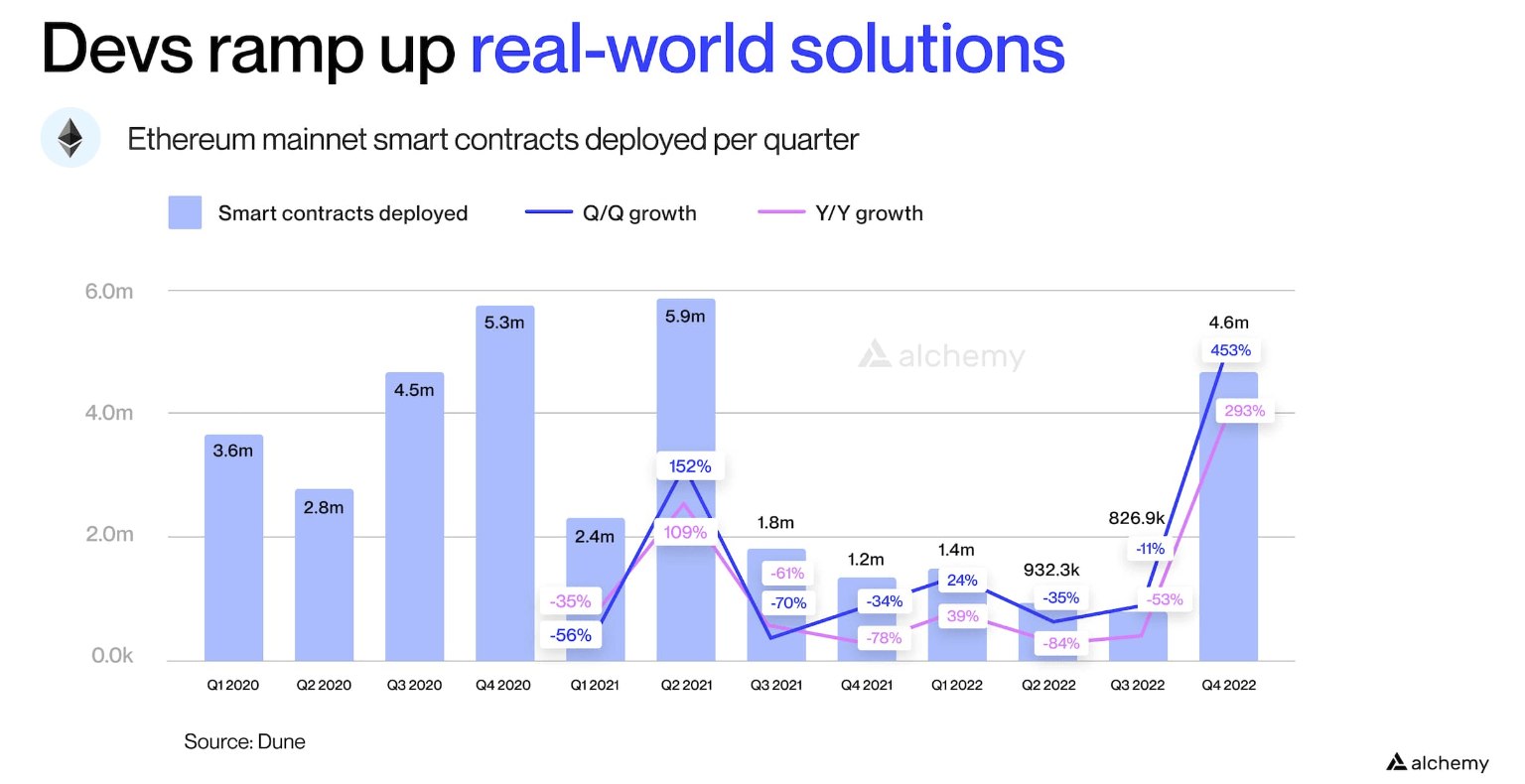 The number of deployed smart contracts on the Ethereum (ETH) mainnet surged by 453% in the fourth quarter of 2022, while the year-over-year growth was calculated as 293%, according to a recent report from Alchemy.