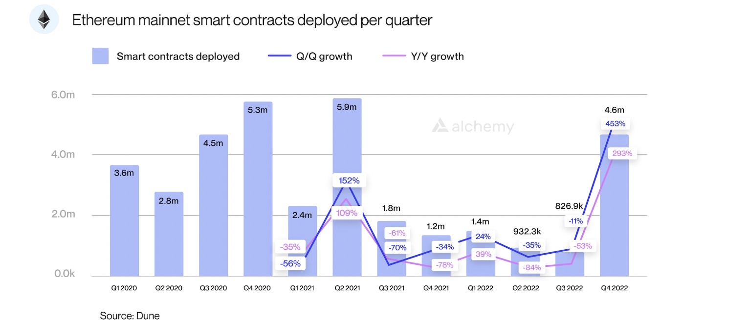 In 2022, Ethereum saw a 178% increase in developer activity for programming libraries, reaching 1.5 million downloads. Despite the market being down, developers have ramped up real-world solutions and continue to build smart contracts on Ethereum at a blistering pace, hitting 4.6 million deployments for Q4 2022.