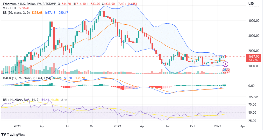 On the weekly chart, candlesticks are forming in the upper Bollinger Bands, but Ethereum formed a higher high that suggests a bullishness after four green candles. However, the interesting thing is that the last two weekly candles are indecisive Doji, which also suggests selling pressure.