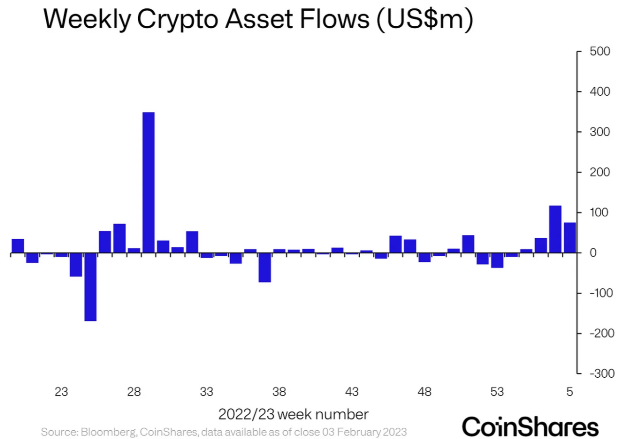 Healthy investment flows into the crypto space come as prices cling on to impressive gains for the year. Bitcoin and Ethereum are both up around 40% since the start of the year on a combination of factors including 1) macro bets that the Fed won’t have to do too much more tightening in 2023, 2) that post-FTX collapse pessimism was overdone given crypto fundamentals remain sound and 3) increased on-chain and technical signals flashing that the bear market of 2022 is likely over.
