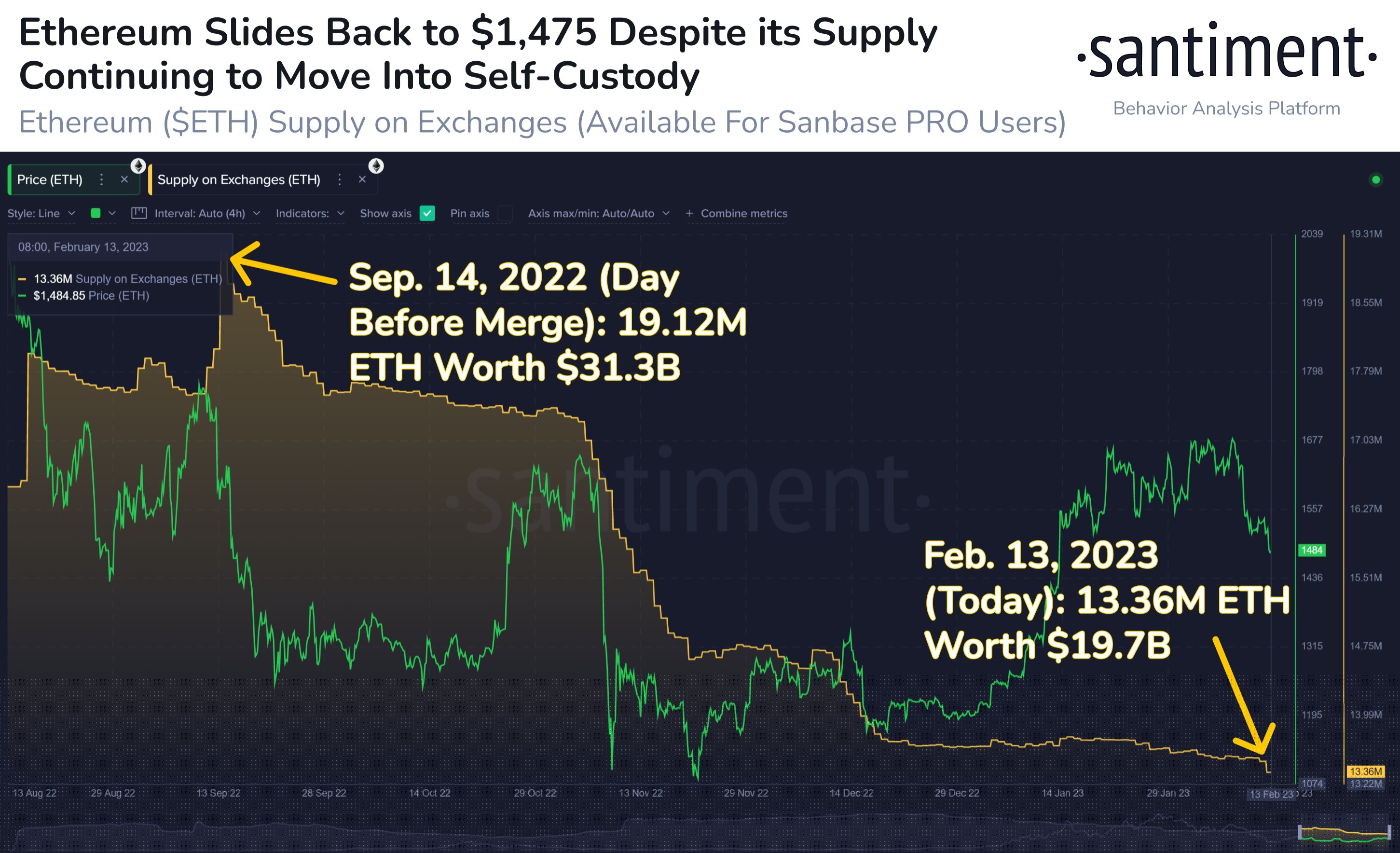 On-chain data from Santiment shows the Ethereum supply on exchanges has dropped by 37% since the Merge in September last year.