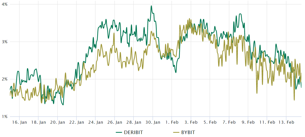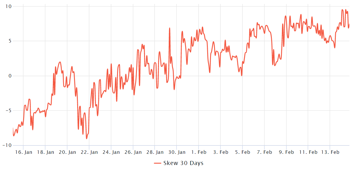 The delta skew flirted with the bearish 10% level on Feb. 14, signaling stress from professional traders. That is a stark contrast from late January when the 25% skew index hovered near 2% — indicating similar upside and downside risks.