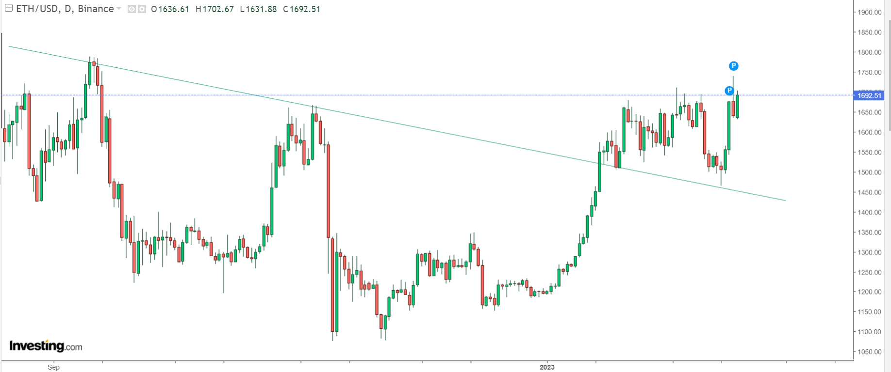 Currently, Ether is trading at $ 1690, up 3.5 % from yesterday's close price.