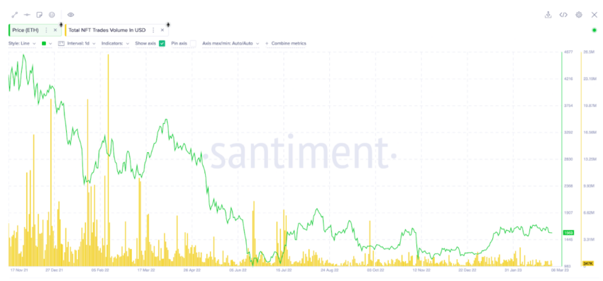 The chart above shows that Santiment recorded $2.34 million in NFT trades across the Ethereum network on Feb. 6. But the NFT trades volume has since reduced to around $730,000 as of March 5.