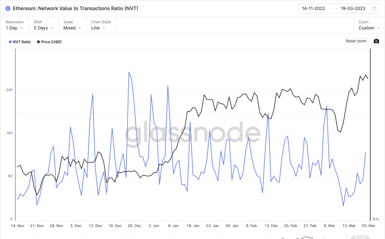 Furthermore, the Network Value to Transactions (NVT) ratio is another critical on-chain metric that supports the bullish thesis. The NVT ratio of Ethereum has dropped considerably compared to the values recorded in the first week of March.
