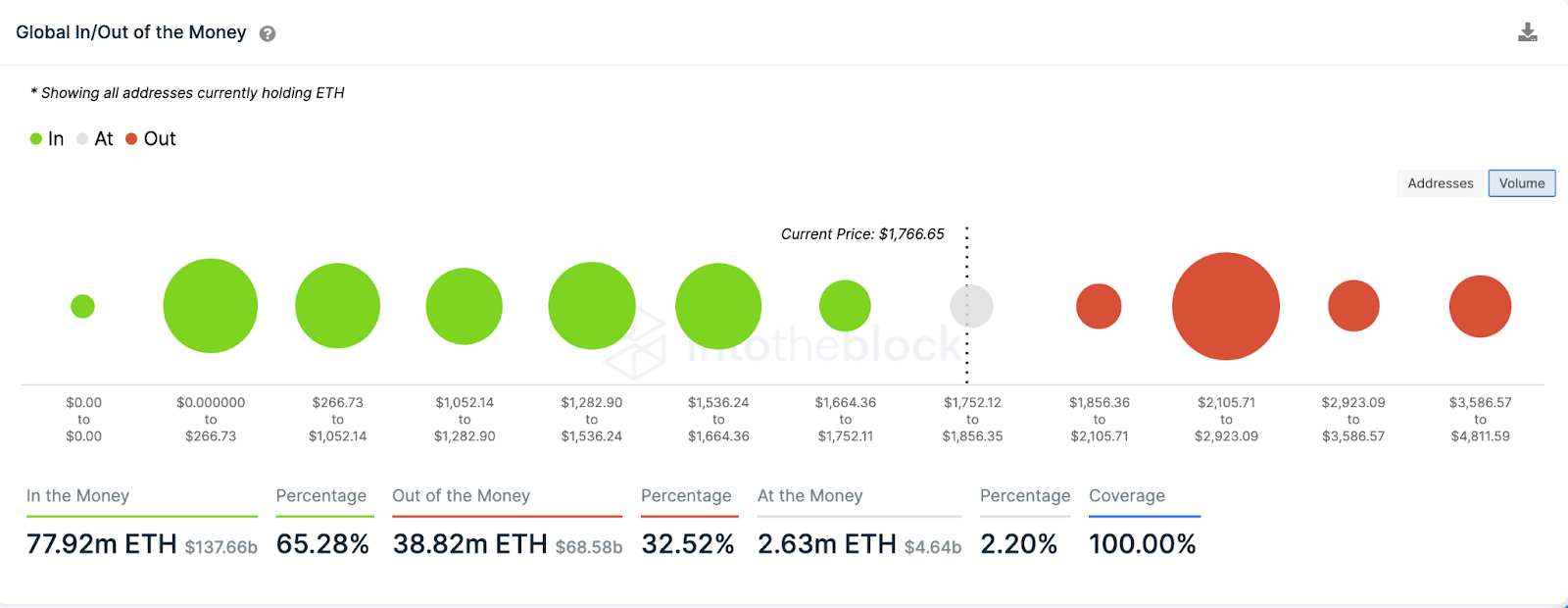 IntoTheBlock’s Global In/Out of the Money (GIOM) data provides insight into the potential ETH bullish price performance. It tracks the price distribution of token holders based on the volume of tokens held in each address.