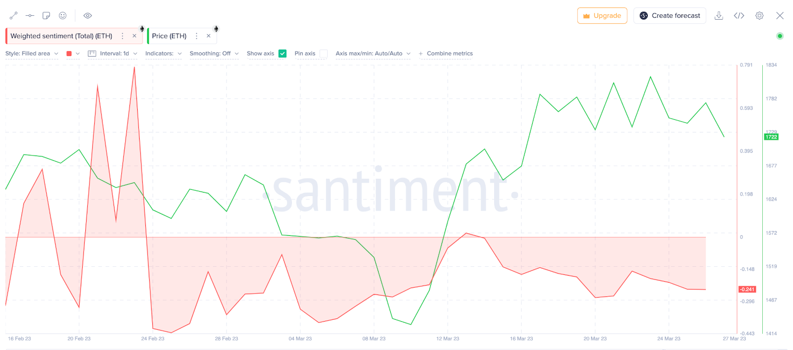 Furthermore, as the scheduled Shanghai Upgrade approaches, the social sentiment surrounding Ethereum has taken a downturn in recent weeks. According to Santiment, Ethereum’s weighted sentiment has remained negative since March 13.