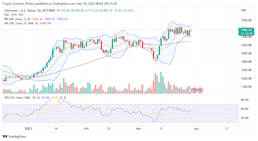 Ethereum is consolidating within a range of $1718 and $1815. Though candlesticks are forming above the 50-day moving average, the price faces resistance around $1800. The Relative Strength Indicators are around 60, which suggests a bullishness in the next few months, probably after the Shanghai update.