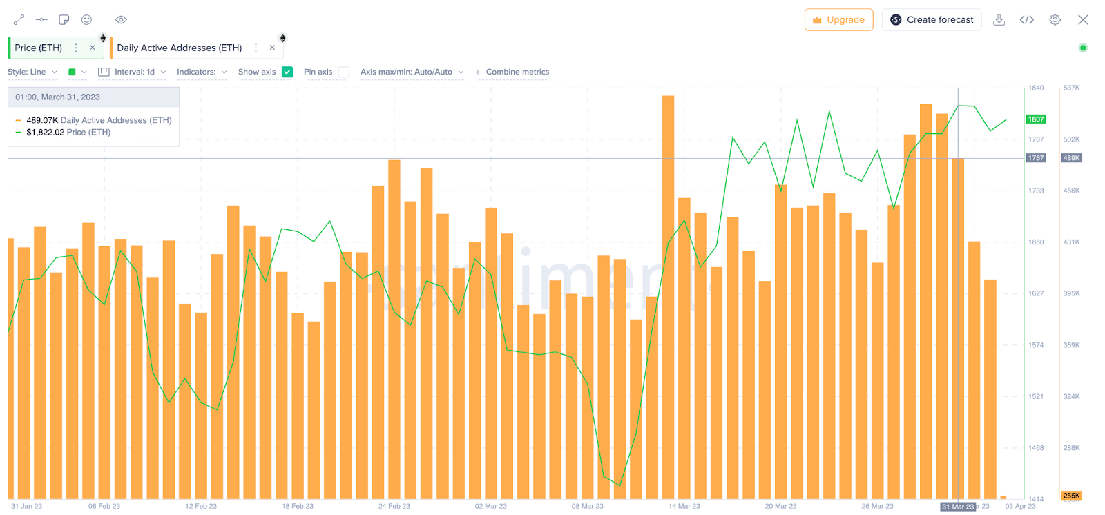 As reported by Santiment, the number of addresses interacting on the Ethereum network in March 2023 has increased considerably compared to February. On March 4, Ethereum’s daily traction hit a local of 377,000 addresses. By April 1, it had surged above 431,000.