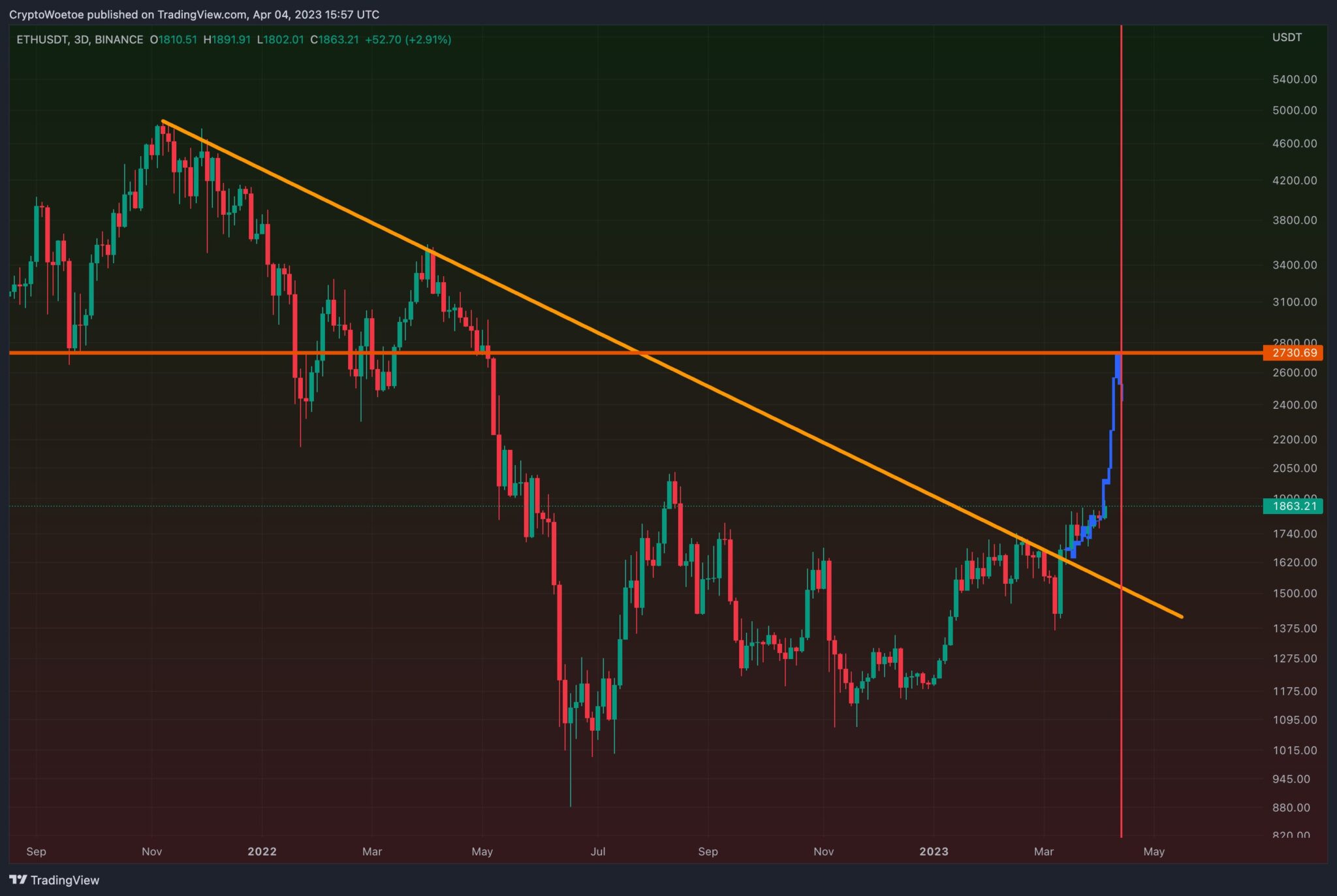 Another interesting trend has emerged in Ethereum’s price action, dating back to its diagonal breakout in 2019. Crypto Analyst under the pseudonym “Woetoe” has identified a blue fractal in ETH’s charts that could offer valuable insights into the cryptocurrency’s future price movements.