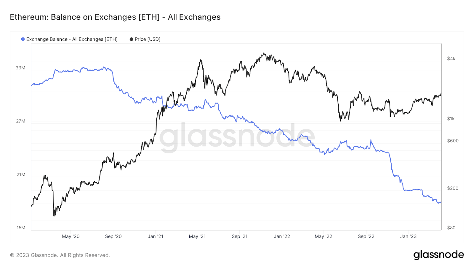 As the chart above shows, there has been a significant drop in the amount of Ethereum on centralized exchanges since May 2020. In general, a lower amount of a digital asset on an exchange, compared to those held in self-custody, is a bullish signal. More Ether on exchanges means a higher likelihood of incoming selling pressure. This suggests that the selling pressure emerging from Shanghai staking unlocks may be less intense.