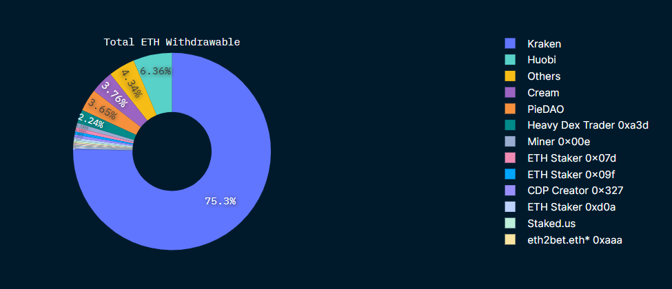 Moreover, data provided by the on-chain analytics platform, Nansen, suggests that the Kraken exchange tops the list of entities withdrawing ethereum — accounting for 75.3%, over 533,000 ETHs, of the total withdrawable coins.