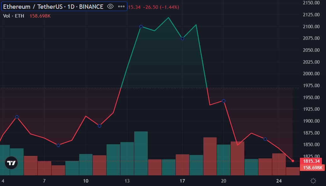 The second-largest cryptocurrency is down by 1.55% in the past 24 hours and witnessed a 13.78% drop over the past week. At the time of publication, ETH is hovering around $1,800 at the time of writing.